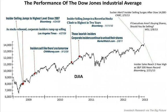 Logická úvaha. Data tento vztah ale nepotvrzují, jak naznačuje graf indexu Dow Jones Industrial Average zahrnující vybrané titulky ohledně obchodních aktivit insiderů.