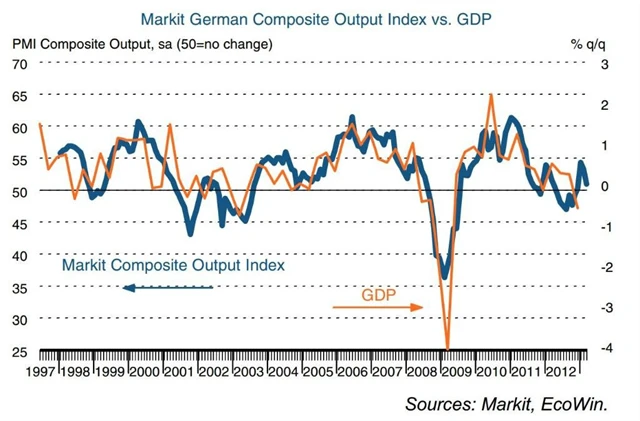 Index nákupních manažerů ve službách za březen 2013 (FLASH) 51,6 bodu. Index nákupních manažerů ve zpracovatelském sektoru za březen 2013 (FLASH) 48,9 bodu (v únoru 50,3 bodu), což představuje tříměsíční minimum.