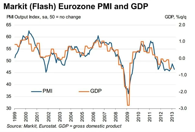 Index nákupních manažerů ve zpracovatelském sektoru za březen 2013 (FLASH) 46,6 bodu (v únoru: 47,9 bodu). Index nákupních manažerů ve službách za březen 2013 (FLASH) 46,5 bodu (v únoru 47,9 bodu).