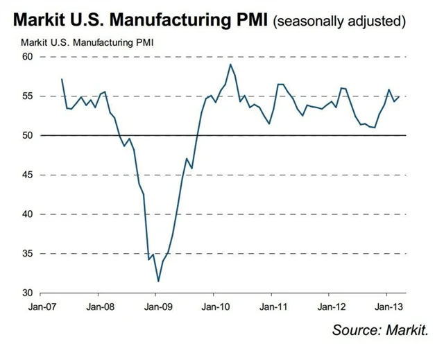 Spojené státy: Index nákupních manažerů ve zpracovatelském sektoru za březen 2013 (FLASH) 54,9 bodu (únor: 54,3 bodu)