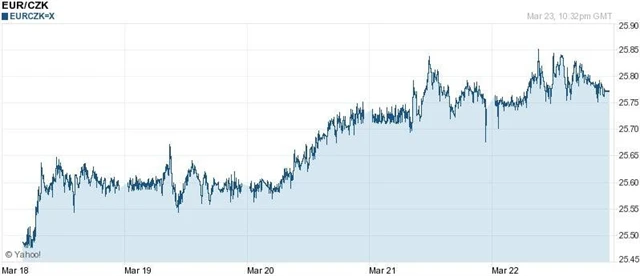 Měnový pár EUR/CZK se na konci týdne přiblížil hodnotě 26. Pokud situace na Kypru vyústí v neřízený odchod z eurozóny, může se koruna udržet pod tlakem. V nejbližších dnech může být česká měna také nervózní z blížícího se zasedání ČNB. I když hospodářství za prognózou spíše zaostává a inflace je nižší, neměla by nicméně ČNB výrazně změnit předpokládanou trajektorii kurzu. I proto jsou jiné než verbální intervence proti koruně stále velice nepravděpodobné, a to kdekoli nad 25 EUR/CZK.