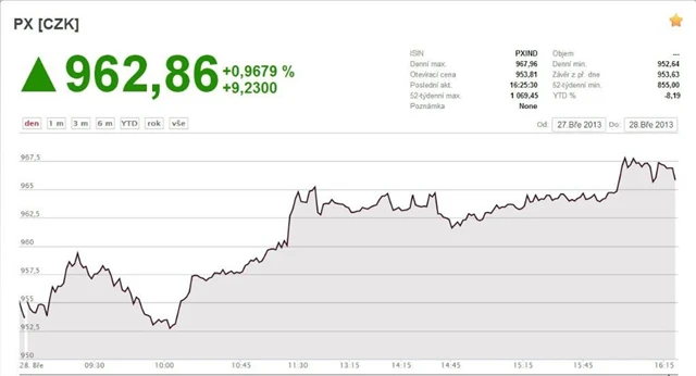 Index PX ve čtvrtek po několikadenním oslabování posílil o 0,97 % na 962,86 bodu.