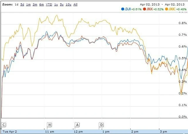 Index Dow Jones vzrostl o 0,61 % na 14 662,01 bodu, S&P 500 posílil o 0,52 % na 1 570,25 bodu a Nasdaq o 0,48 % na 3 254,86 bodu.