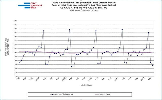 V maloobchodě včetně prodeje pohonných hmot sezonně očištěné tržby klesly reálně meziměsíčně o 1,3 % a meziročně očištěné o vliv počtu dní o 0,2 procenta. Neočištěné tržby se snížily meziročně o 3,6 procenta, v tom za pohonné hmoty o 7,2 %, za potraviny o pět procent a za nepotravinářské zboží o 1,5 %.