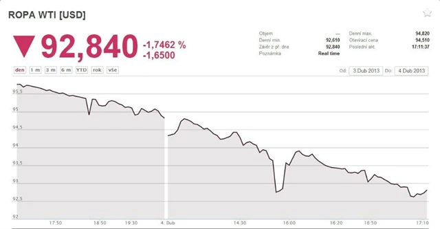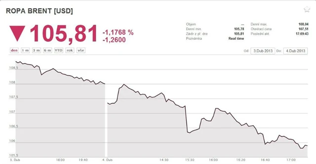 Cena Brentu v 15:30 klesla o 70 centů na 106,41 dolaru za barel. Ve středu severomořská ropa ztratila 3,58 dolaru, což byl její nejhlubší jednodenní propad od počátku listopadu. WTI oslabila o dolar a půl na zhruba 93 dolaru za barel.
