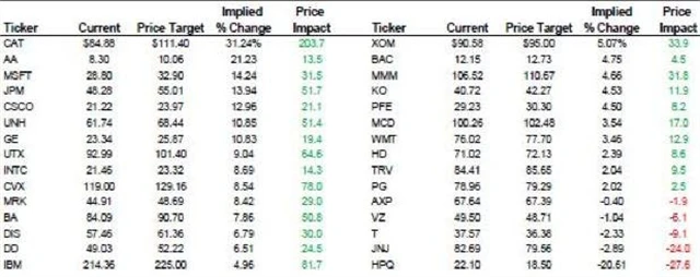 Zkušený investor Laszlo Birinyi ví, jak se dobrat k cílové ceně podle Wall Street, ačkoli ta je na výhledy pro zastaralý Dow relativně skoupá. "Vypočítejte si očekávanou cenu Dow z cílových cen jeho konstituentů," radí. Podle těch má nyní Dow růstový potenciál zhruba 5,6 % na 15 485 bodů.