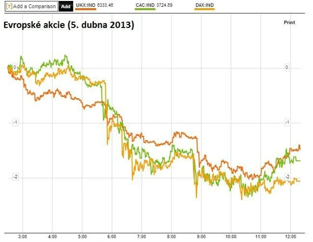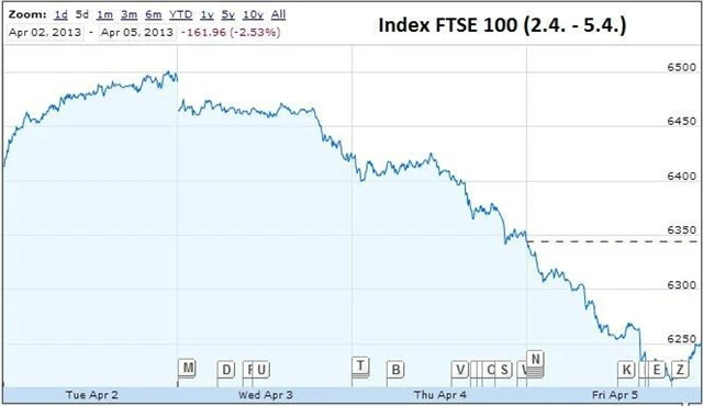 První dubnový týden tak byl pro evropské akcie velmi neúspěšný - FTSE 100 spadl o 2,53 %, CAC 40 o 1,82 % a DAX 1,75 %.