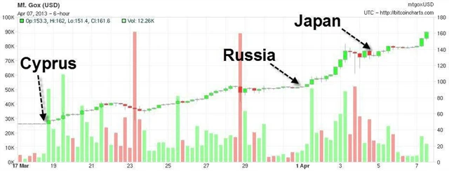 Tuhle bublinu nezastavily ani hackerské útoky. Bitcoin, zatím v podstatě neregulovaná internetová měna, jíž se dá platit na stále více místech za reálné zboží a služby, za poslední měsíc zečtyřnásobila hodnotu. Nejprve její cenu hnaly vzhůru problémy Kypru (především jejich řešení, do kterého byli zataženi střadatelé v bankách), pak ruská výzva k repatriaci kapitálu v daňových rájích, a nakonec slíbené agresivní měnové uvolňování v Japonsku.