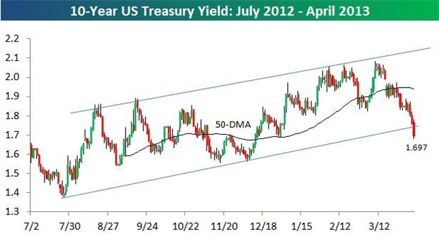 Od loňského července výnosy amerických státních dluhopisů stabilně rostly v rámci stoupajícího kanálu. Data z americké ekonomiky se totiž neustále zlepšovala, což paradoxně vyvolávalo menší zájem o americké dluhopisy jako konzervativní aktivum. Údaje z uplynulého týdne ovšem přiměla dluhopisy prorazit tento trend - útěk do bezpečí byl více než patrný. Technicky tedy výnosům nic nebrání v cestě níže.