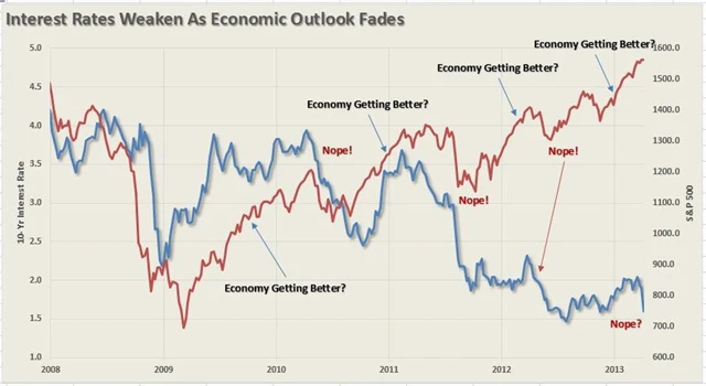 Druhý graf ukazuje vývoj amerického akciového indexu S&P 500 a výnosy z amerických 10letých bondů. Ty v posledních letech na každý signál ekonomického oživení vyslaný akciovým trhem rezolutně odpověděly "ne". Bude tomu tak i v aktuálním případě, kdy akcie atakují historická maxima?