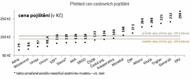 Některé instituce všechny podmínky splnily až ve vyšších/dražších balíčcích, a proto je v pojištění zahrnuto často i více rizik, než požadovala modelová situace. Uvedená částka je celkem pro 1 osobu na 4 dny. Pojišťovny jsou seřazeny abecedně.
