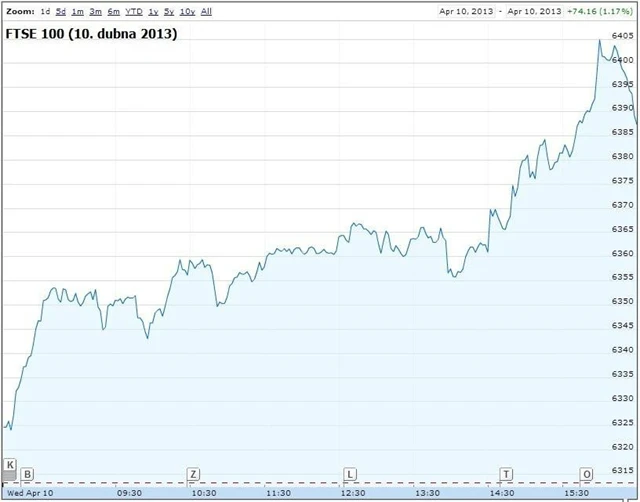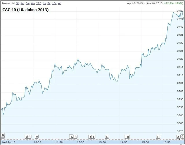 Burzy v západní Evropě ve středu posilovaly. Britský FTSE 100 vzrostl o 1,17 % na 6 387,37 bodu, francouzský CAC 40 připsal 1,99 % na 3 743,71 bodu a německý DAX po předchozím mírné oslabení poskočil výše o 2,27 % na 7 810,63 bodu. Akcie velmi pozitivně reagovaly na to, že index S&P 500 pouze pár minut po zahájení obchodování ve Spojených státech překonal intradenní maximum 576,09 bodu a dále rostl.