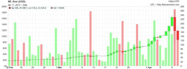 Kybernetická měna bitcoin během pouhých 24 hodin přišla o téměř 80 % své hodnoty. Z 266 dolarů za jeden bitcoin sestoupila na pouhých 55 dolarů. Masivní výprodej odstartoval po zprávě, že burza Mt. Gox má problémy se zpracováním rostoucího objemu obchodů. Později obchodování na 12 hodin přerušila. Podle analytika Nicholase Colase je "velkou otázkou", zda měna dokáže rozsáhlé výkyvy svého kurzu přežít.