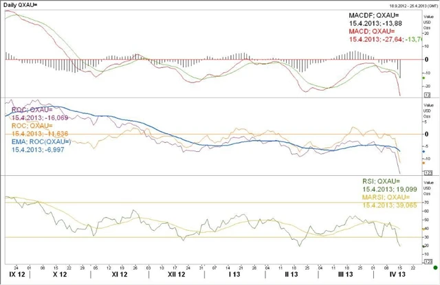 Kombinace silné přeprodanosti a hladiny podpory 1 410 USD sugeruje možnost korekce. Záležet bude na tom, zda v pondělí zlato zavře nad touto hladinou. Pokud ano, pravděpodobnost korekce dále vzroste. Potvrzené proražení (pokles pod 1 370) by otevřelo cestu k dalšímu pokles, přičemž odhadnutelná hladina podpory je až na psychologické hladině 1 300 (1 310 je lokální minimum z konce ledna 2011, 1 289 je Fibonacciho hladina).