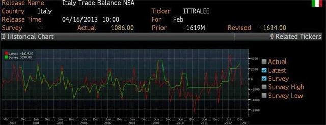 Zahraniční obchod Itálie skončil v únoru přebytkem 1,086 miliardy eur. Za leden byl deficit revidován z -1,619 na -1,614 miliardy eur.