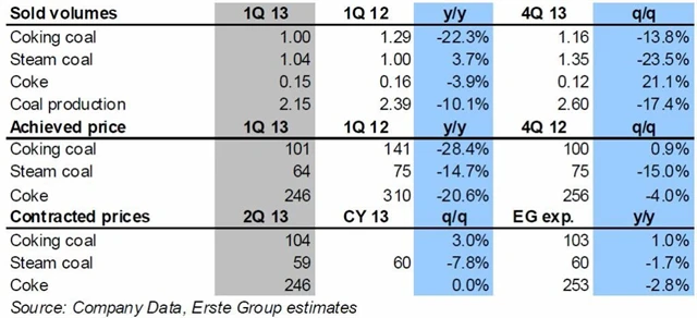Průměrná nasmlouvaná cena pro prodeje koksu ve druhém čtvrtletí roku 2013 je 246 eur za tunu, tedy stejná jako realizovaná cena za první čtvrtletí 2013. Průměrná cena koksu je založena na očekávání, že prodeje ve druhém čtvrtletí roku 2013 budou tvořeny přibližně z 66 % slévárenským koksem, z 23 % koksem vysokopecním a z 11 % ostatními druhy koksu.