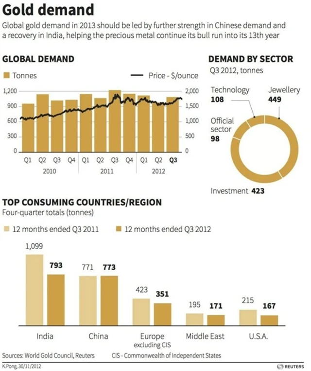 12. Extrémně silná poptávka v Číně a Indii: Hlad Číny a Indie po zlatě je stále obrovský. V případě Indie na tom moc nezměnil ani fakt, že vláda ve snaze omezit import zlata zdvojnásobila dovozní clo. Indové si žlutý kov zamilovali, a to nejen pro jeho estetické vlastnosti. Již v současnosti jsou největším světovým spotřebitelem zlata a podle všech předpovědí by tamější poptávka měla i přes současné zaváhání nadále růst.