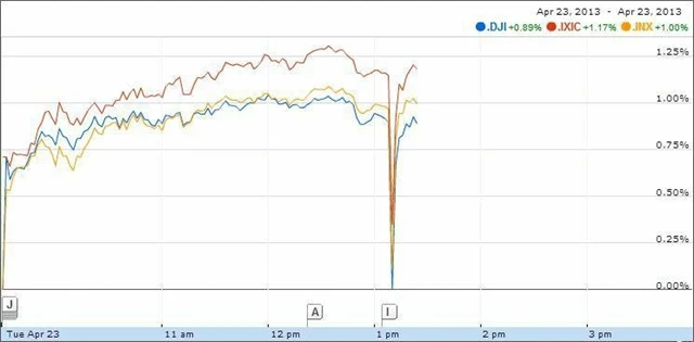 Americké akcie krátce prudce oslabily, když na Twitteru vyšla zpráva, že byl spáchán bombový útok na prezidenta Baracka Obamu, který měl být zraněn. Tweet totiž poslala agentura AP. Ta ovšem vzápětí oznámila, že byl její účet napaden hackery. Akcie pak okamžitě napravily své ztráty.