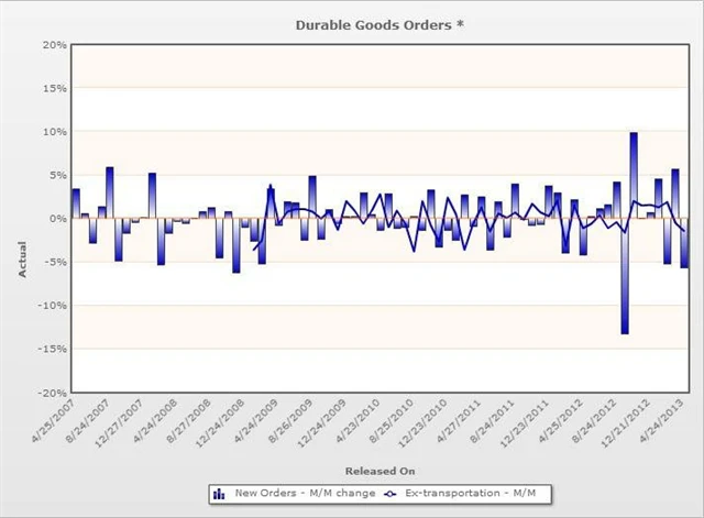 USA: Objednávky zboží dlouhodobé spotřeby v březnu dramaticky poklesly o 5,7 %, bez dopravy -1,4 % (odhad: -2,8 %, bez dopravy: +0,5 %)