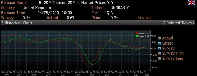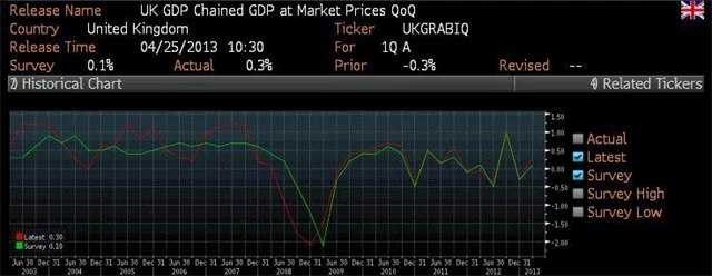 Ekonomika Spojeného království rostla rychleji, než ekonomové očekávali. Podařilo se jí tak vyhnout se recesi s trojitým dnem. Podle britského statistického úřadu rostla ekonomika mezikvartálně o 0,3 %. Konsenzuální předpovědi 37 ekonomů oslovených agenturou Bloomberg přitom očekávaly pouze 0,1% růst. Ve srovnání s minulým rokem vzrostl HDP o 0,6 %, tedy nejvíce od čtvrtého čtvrtletí 2011.