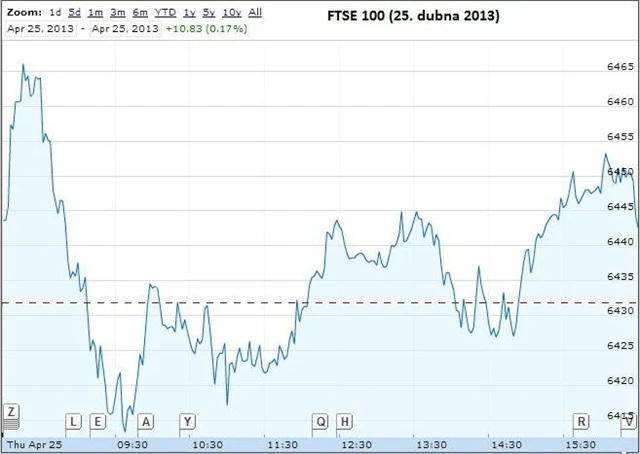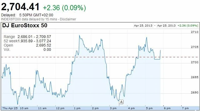 Čtvrtek byl dnem hospodářských výsledků. Švédský výrobce aut Volvo se v prvním čtvrtletí propadl do ztráty a tržby byly nejnižší za pět let. Hodnota nově přijatých objednávek se však zvýšila. Německé chemické a farmaceutické firmě Bayer AG stoupl v prvním čtvrtletí čistý zisk o 11,5 % na 1,16 miliardy eur. Firmě pomohl růst prodeje nových léků a vyšší poptávka na rozvíjejících se trzích, které překonaly i slabší prodej v Evropě způsobený recesí. Zisk společnosti AstraZeneca překonal očekávání, tržby však odhadů nedosáhly. Banco Santander v prvním kvartále dosáhla čistého zisku 1,21 miliardy EUR (odhad: 1,31 miliardy EUR). Podíl špatných úvěrů banky vzrostl mezikvartálně z 4,54 % na 4,76 %. I Electrolux ohlásila nižší zisk, než se čekalo: 361 milionů švédských korun (odhad: 517,5 milionu švédských korun). A hůře dopadly i tržby Unileveru: 12,2 miliardy EUR (odhad: 12,5 miliardy EUR). Firma ale příjemně překvapila dividendou, která naopak překonala očekávání (26,9 centu na akcii vs. 25,5 centu).