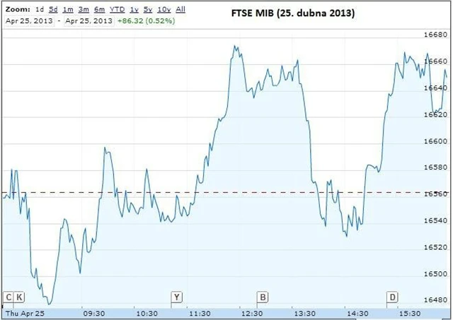 Dařilo se i burzám na jihu Evropy. Italský FTSE MIB připsal 0,52 %, přestože médii proletěla zpráva o tom, že Silvio Berlusconi možná bude bojkotovat vytvoření vládní koalice. Španělský IBEX 35 reagoval na tragické zprávy z trhu práce a ztratil 0,29 %.