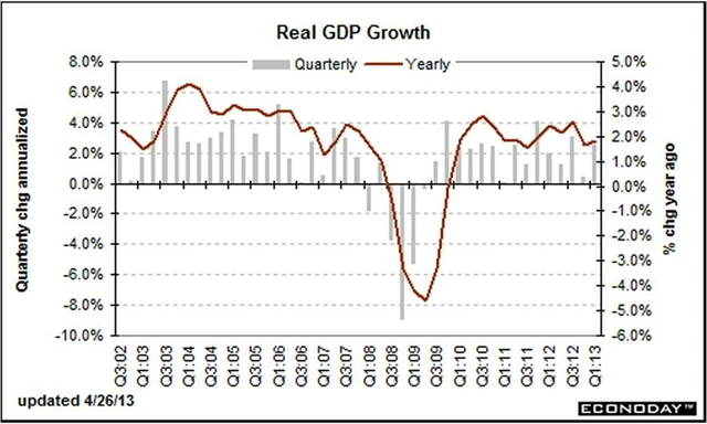 Analytici předpokládali, že se růst ekonomiky Spojených států v prvním kvartálu zrychlí díky osobní spotřebě, která měla podle odhadů oživit nejvíce za poslední dva roky (a na celkové ekonomické aktivitě USA se podílí 70 %), a podnikovým zásobám. HDP vzrostl, ale očekávání +3 % nenaplnil - vzrostl pouze o 2,5 % mezikvartálně. V posledním čtvrtletí roku 2012 HDP vzrostl na celoroční tempo 3 %, kvartálně +0,4 %. Osobní spotřeba však příjemně překvapila, poskočila o 3,2 % oproti očekávaným 2,8 %.
