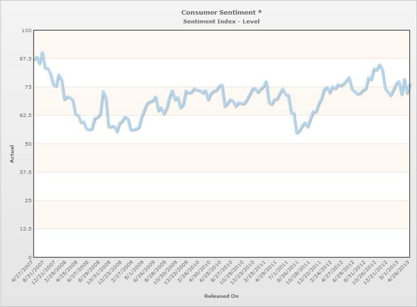 Index spotřebitelské důvěry Michiganské univerzity v první polovině dubna spadl na 72,3 bodu ze 78,6 bodu na konci března. Finální číslo za duben bylo sice vyšší, než se čekalo (76,4 bodu oproti očekávaným 73 bodům), oproti březnovému výsledku se však i přesto jedná o pokles o 2,2 bodu na tříměsíční minimum.