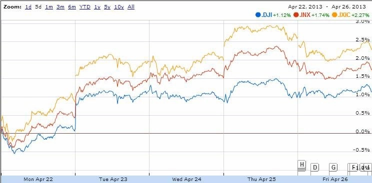Americké akcie v pátek s výjimkou třicítky největších titulů (index Dow) uzavřely mírným poklesem, za celý týden ale oživily. Páteční útlum trhu způsobily nečekaně slabé údaje o ekonomickém růstu USA za první čtvrtletí a nižší zisky internetového obchodu Amazon.com. Příznivé výsledky některých velkých společností ale ke konci dne vytlačily Dow index do kladného pásma.
