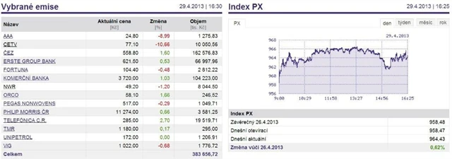 Pražské burze se v pondělí dařilo. Index PX připsal 0,62 %. Nejvíce si polepšily akcie Telefóniky C.R. (+2,70 %) a developera Orco (+1,66 %). Propadly naopak cenné papíry CETV (-10,66 %), která v prvním čtvrtletí ohlásila čistou ztrátu na akcii 1,22 USD a AAA Auto (-8,99 %). Erste Group Bank, která si podle ohlášených výsledků sice v prvním čtvrtletí meziročně pohoršila, však mírně připsaly (+0,53 %), protože čísla potvrzují solidní pozici z hlediska likvidity a schopnost snižovat provozní náklady.