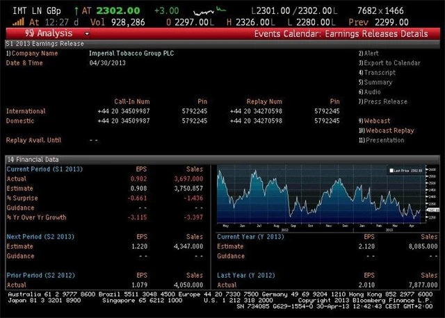 Výsledky Imperial Tobacco Group v období říjen 2012 - březen 2013: Zisk na akcii 0,902 liber (odhad: 0,908 liber), tržby 3,697 miliardy liber (odhad: 3,750 miliardy liber)