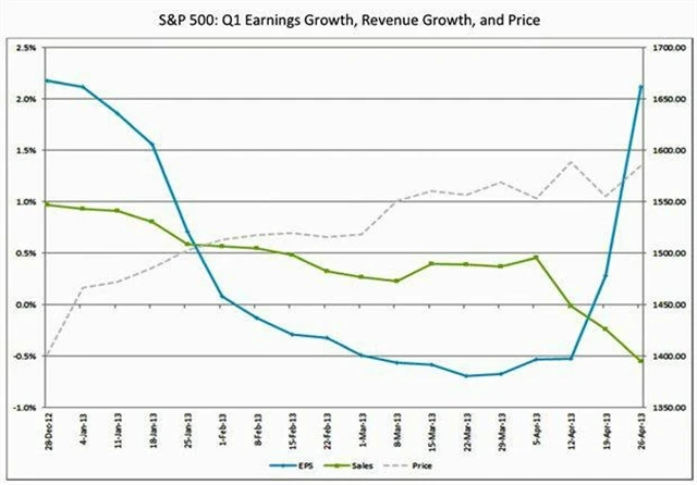 Do pondělí 29. dubna vykázaly americké firmy růst zisku. Oproti hodnotě z konce března ((-0,7 %) se situace zlepšila na +2,1 %. Pouze 44 % firem ovšem překonalo odhady tržeb, v posledních čtyřech letech se to přitom v průměru dařilo 57 % společností. Růst tržeb je totiž negativní.