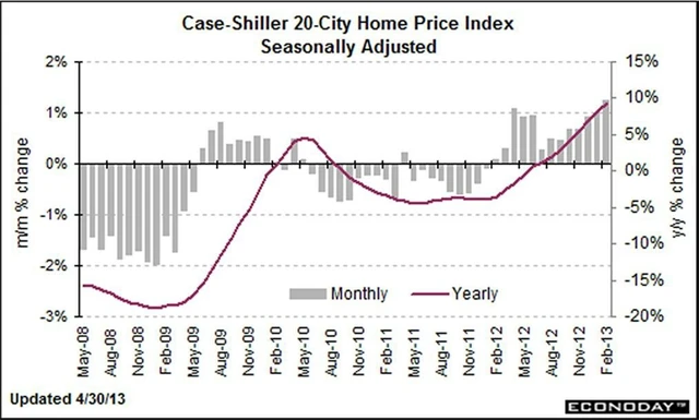 Index cen domů ve 20 metropolitních oblastech USA vzrostl v meziročním srovnání o 9,3 % (odhad: 9 %, leden: 8,1 %), což byl jeho nejvyšší nárůst od května 2006, kdy v USA vrcholila takzvaná "bublina" nadhodnocených realit. Její následný krach vyvolal vážnou finanční krizi a hlubokou recesi. Meziměsíčně vzrostly ceny domů o 0,3 % (sezónně neočištěno).