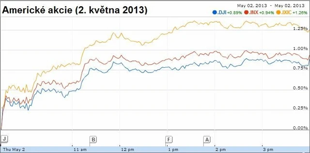 Index Dow Jones Industrial Average se pohybuje na rekordech, uzavřel se ziskem 0,89 % na 14 831,58 bodu, širší S&P 500 přidal 0,94 % na 1 597,59 bodu a technologický index Nasdaq vzrostl o 1,26 % na 3 340,62 bodu. Nejvíce se dařilo energetickým, dopravním a technologickým titulům, mírné ztráty si naopak připsal defenzivní sektor veřejných služeb.