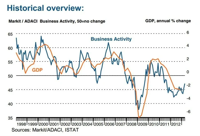 Italský sektor služeb v dubnu dále propadal, tempo poklesu jak v oblasti vstupu nových firem do odvětví, tak v oblasti zaměstnanosti se zpomalil nejméně za posledních 20 měsíců.
