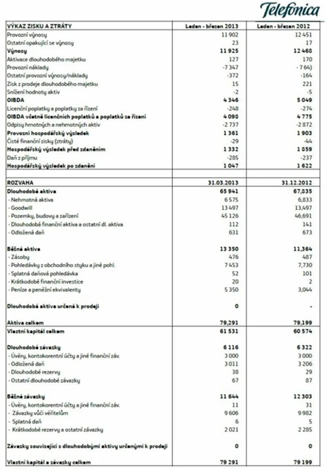 Výsledky Telefóniky za 1Q2013: Čistý zisk 1,05 miliardy Kč (-35,5 %), tržby 11,9 miliardy Kč (-4,4 %)