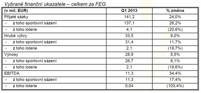 Celková výše přijatých sázek vzrostla v prvním čtvrtletí 2013 o 24,0 % na 141,2 milionu eur. Celková výše hrubých výher vzrostla v prvním čtvrtletí 2013 o 9,0 % na 33,5 milionu eur. Hrubé výhry ze sportovního sázení po internetu se v prvním čtvrtletí roku 2013 zvýšily o 33,8 % na 13,6 milionu eur. Celkový zisk EBITDA vzrostl v prvním čtvrtletí o 34,4 % na 11,3 milionu eur, čímž překonal odhady analytiků o 27,4 %.