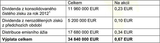 "Vedení společnosti navrhne řádné valné hromadě, která se koná tento měsíc, výplatu dividendy ve výši 0,67 eur na akcii, složenou z dividendy z čistého zisku za rok 2012, z dividendy z nerozdělených zisků a distribuce emisního ážia," dodal Radim Haluza.
