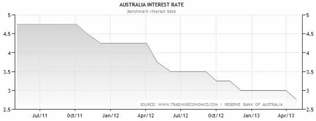 Australská centrální banka dnes snížila hlavní úrokovou sazbu o čtvrt procentního bodu na rekordní minimum 2,75 %. Banka se tak snaží podpořit ekonomiku v době, kdy růst těžebního průmyslu oslabuje a místní firmy ohrožuje silný australský dolar. Navzdory poklesu ale hlavní úroková sazba v Austrálii zůstává nejvyšší ve srovnání s dalšími předními rozvinutými ekonomikami světa.