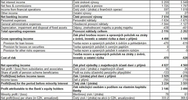 Výsledky Komerční banky byly mírně pod odhady analytiků, a to navzdory nižším nákladům. O více než 40 % totiž klesly výnosy z obchodování. Celkové provozní výnosy meziročně klesly o 9,2 %. Pokles ovlivnily jednorázové výnosy z prodeje části dluhopisového portfolia Penzijního fondu KB, který předcházel jeho transformaci. Čisté úrokové výnosy klesly o 5,2 %, čisté výnosy z poplatků a provizí o 4 %. Čistý zisk z finančních operací se propadl o 41,4 %. "Náklady rizika se snížily o čtvrtinu, neboť skupina KB si udržela velmi dobrou kvalitu úvěrového portfolia," řekl novinářům výkonný ředitel pro strategii a finance Libor Löfler.