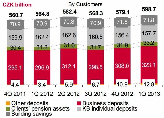 Objem vkladů stoupl o 6 % na 598,7 miliardy Kč. Individuální vklady meziročně klesly o 2,9 % na 157,7 miliardy Kč. Firemní vklady naopak vzrostly o 8,8 % na 323,1 miliardy Kč.