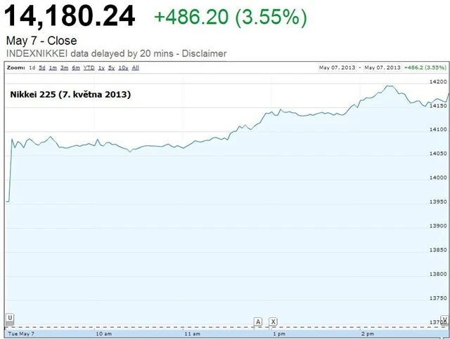 Nikkei připsal 3,55 % a poprvé od června 2008 se obchodoval nad 14 000 body. Širší Topix vzrostl o 3,06 % na hodnotu naposledy zaznamenanou před pádem Lehman Brothers z 15. září 2008.