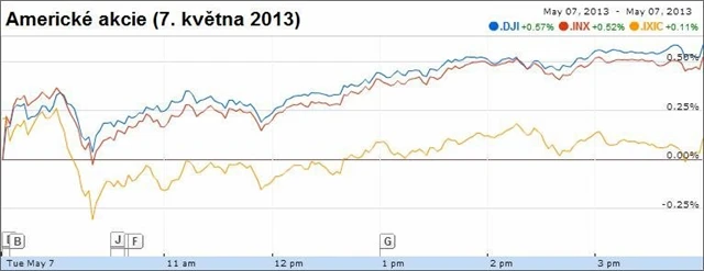 Dow přidal 87,31 bodu a obchodní den uzavřel o 0,58 % výše na 15 056,20 bodu. Širší index S&P 500 vzrostl o 0,52 % na 1 625,96 bodu, což je rovněž nový rekord. Index technologického trhu Nasdaq Composite smazal průběžné ztráty, přidal 0,11 % a končil na 3 396,63 bodu.