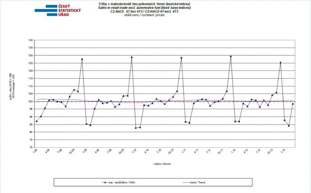 ČR: Maloobchodní tržby v březnu meziměsíčně +1,4 %, meziročně -0,1 %