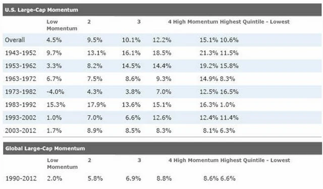 Níže uvedené tabulky ilustrují efekt momenta u amerických large caps a světových akcií. Každý sloupec reprezentuje pětinu z celkového počtu akcií ve vzorku, řazeny jsou podle svého momenta. Zatímco neexistuje lineární vztah mezi kvintily momenta, akcie s nejvyšším momentem dlouhodobě překonávají výkonností ty z nejnižších kvintilů. Small caps měly tendenci předvádět silnější efekt momenta, byly ale pro obchodování mnohem dražší.