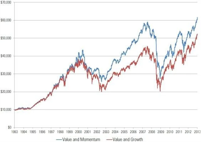 Graf níže porovnává výkonnost portfolia složeného rovným dílem z hodnotového a růstového indexu Russel 1000 s portfoliem, které nahrazuje růstovou alokaci AQR Momentum indexem. Dvě portfolia mají podobnou volatilitu, ale hodnotové a momentum portfolio nabízejí nepatrně lepší absolutní a rizikově očištěné výnosy.
