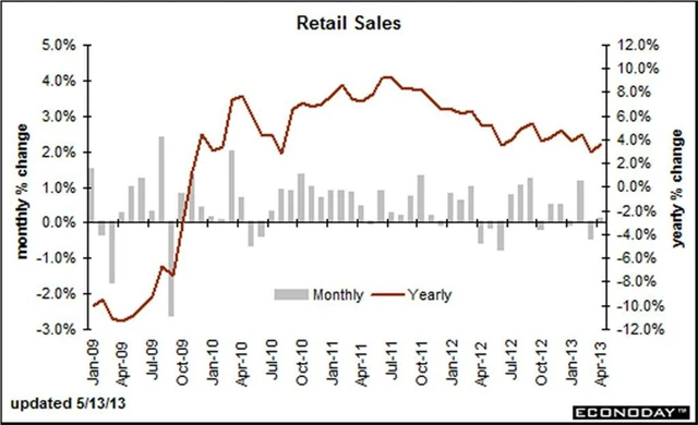 "Dubnové maloobchodní tržby jsou dalším příkladem obecně slabého výsledku, který je vnímaný jako pozitivní jen proto, že překonal odhady," říká Jim Baird z Plante Moran Financial Advisors. "Od začátku roku přitom vidíme stále velmi omezený růst maloobchodních tržeb."