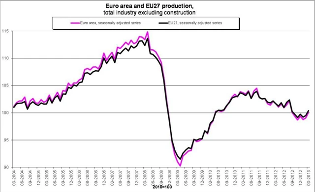 Za celé první čtvrtletí se průmyslová produkce v eurozóně zvýšila o 0,2 procenta. Příznivé údaje o vývoji průmyslu podle agentury AP vyvolaly naděje, že hospodářská recese v zemích eurozóny polevila, nebo že dokonce skončila.