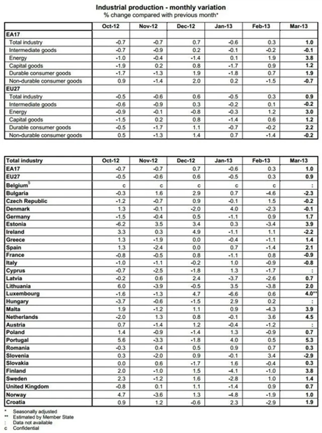 Průmyslová výroba v eurozóně v březnu vzrostla více, než se čekalo, v meziročním srovnání poklesla méně. Oproti únoru vzrostla o procento, zatímco se předvídal růst pouze o 0,5 %. Jde o nejvyšší tempo růstu za 20 měsíců. V EU27 vzrostla o 0,9 %. Nejlépe si meziměsíčně vedlo Portugalsko (+5,3 %), nejhůře naopak Slovinsko (-2,9 %).