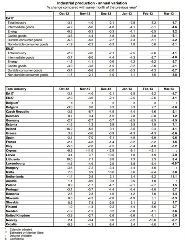 Meziročně produkce v eurozóně klesla o 1,7 % po únorových -3,2 % (čekal se pokles o 2,1 %). V EU27 klesla o 1,1 %. Nejlépe dopadlo Nizozemsko, které oproti březnu loňského roku výrobu rozšířilo o 11,1 %, nejhůře naopak Norsko s meziročním poklesem o 8,7 %. Některé země však oficiální čísla zatím nezveřejnily.
